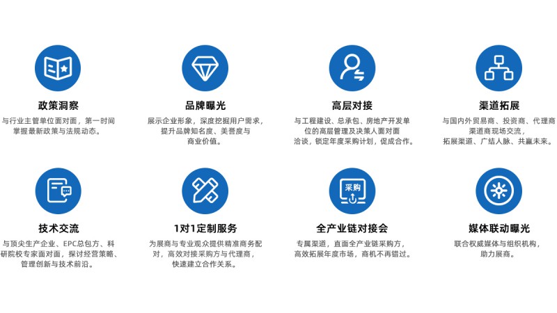央企及地方总包商参yu度高,供采双方对接、采购观展团,特邀EPC工程总承包单位洽谈区内对接。组织以集团为单位的采购观展团。提前登记采购单位拟在建工程项目、工程采购计划需求;提前提供展商展品宣传;现场VIP采购单位宣传册,通过采购方调研反馈,为展商提供更高附加值的专属服务;提前调研采购单位考察供应商意愿,展后按计划有序安排,为展商提供增值服务。