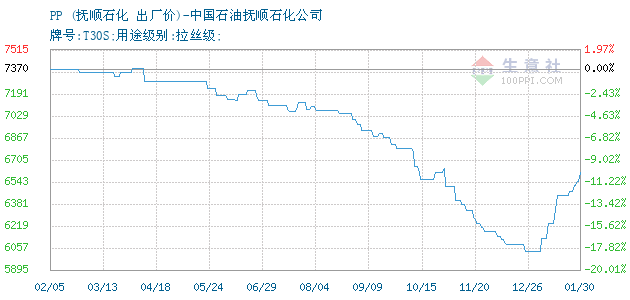 10月11日中国石油抚顺石化公司关于PP的报价为8350元/吨。PP的规格:牌号:T30S;用途级别:拉丝级;。该报价有效期为3天。报价提供方:中国石油抚顺石化公司。 拓展浏览资讯: