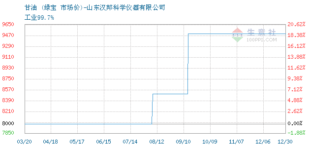 12月10日绿宝关于甘油的报价为6500元/吨。甘油的规格:工业99.7%。该报价有效期为3天。报价提供方:山东汉邦科学仪器有限公司。 拓展浏览资讯: