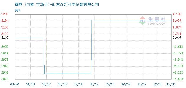 12月10日内蒙关于草酸的报价为5900元/吨。草酸的规格:99%。该报价有效期为3天。报价提供方:山东汉邦科学仪器有限公司。 拓展浏览资讯: