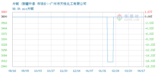 07月02日新疆中泰关于片碱的报价为3350元/吨。片碱的规格:99.0% min片碱。该报价有效期为3天。报价提供方:广州市天悦化工有限公司。 拓展浏览资讯: